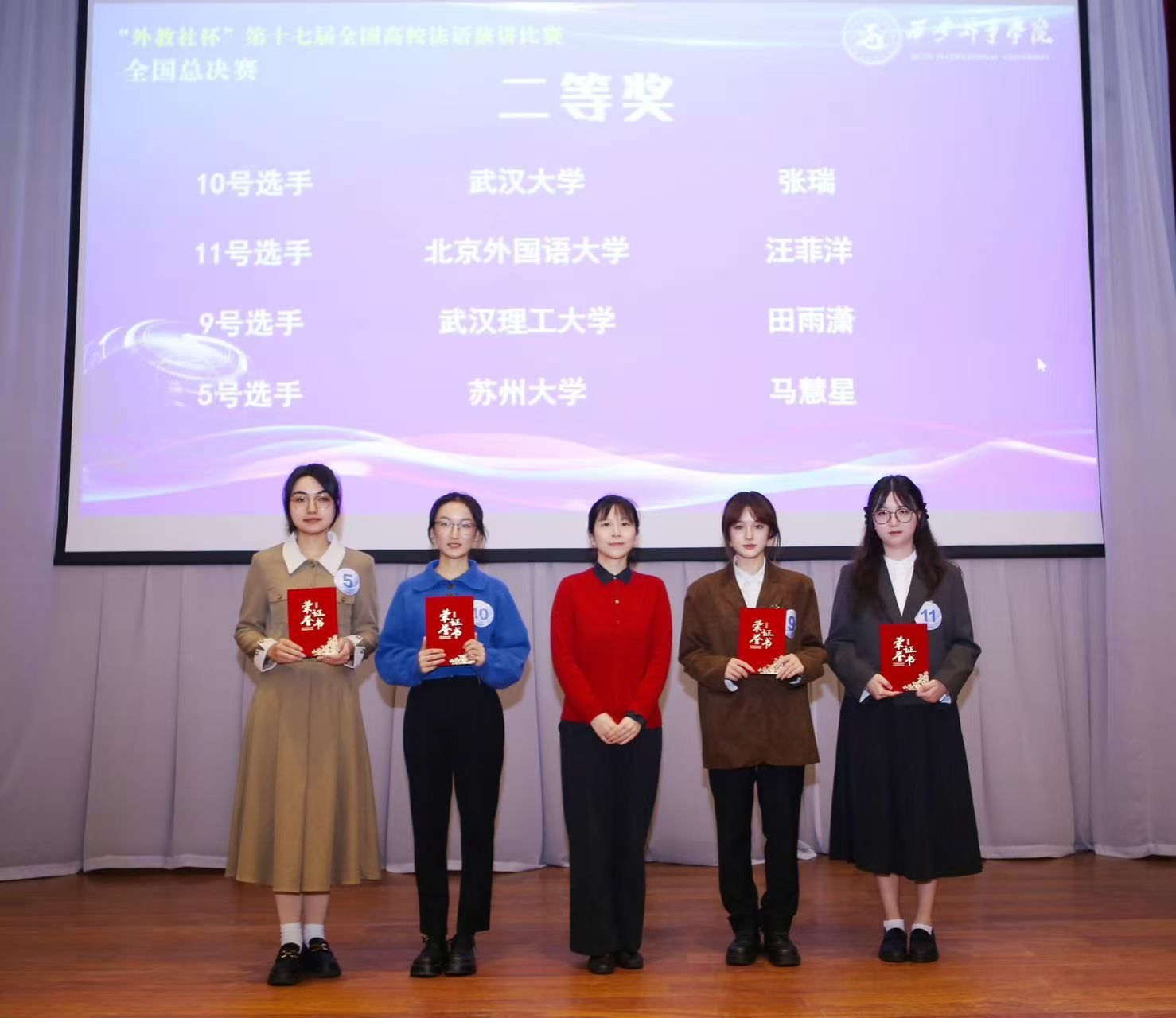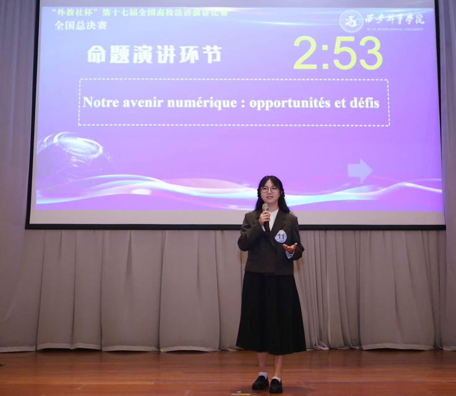 在强手如林的赛场上,汪菲洋同学沉着应战,以流畅地道的法语表达、条理清晰的逻辑思维和从容自信的台风,充分展现了我院学子扎实的专业素养和全面的综合能力。无论是主题演讲中的深入阐述,还是即兴演讲环节的机智应对,她都发挥稳定,最终在激烈角逐中斩获二等奖,为学校赢得了荣誉。
